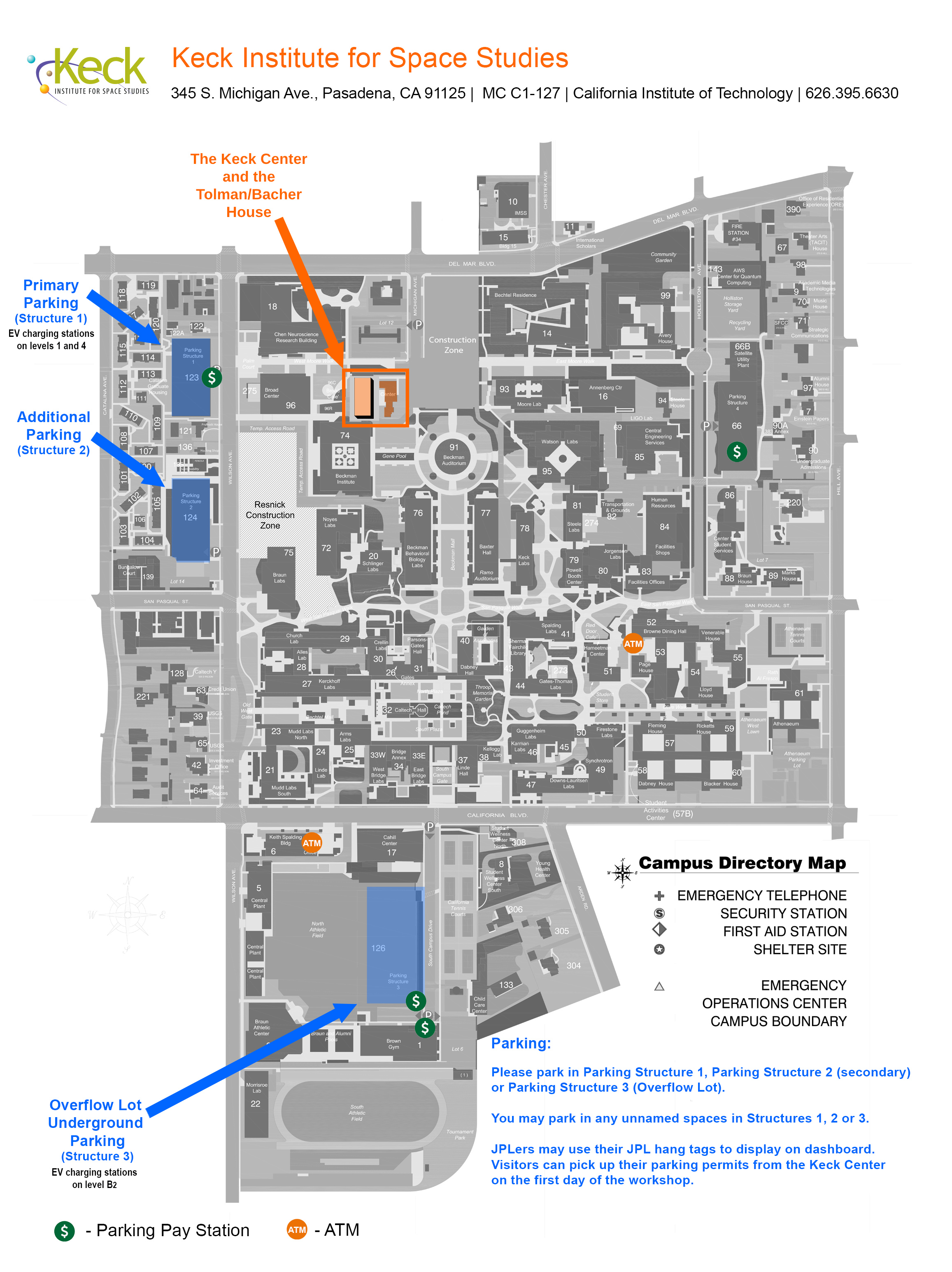 Take Arroyo Parkway straight ahead (north); turn right (east) on California Blvd. Proceed approximately 1.1 miles. Turn left onto S. Wilson Ave and proceed to Caltech's Parking Structure #1 or Parking Structure #2. Please park in a commuter spot. The overflow parking is located in Parking Structure #3 (under the softball field) on California Blvd (next to the tennis courts). Purchase a parking permit at the kiosk inside the Parking Structures #1 or #3 and display it on your dashboard. JPLers may use their JPL hang tag.