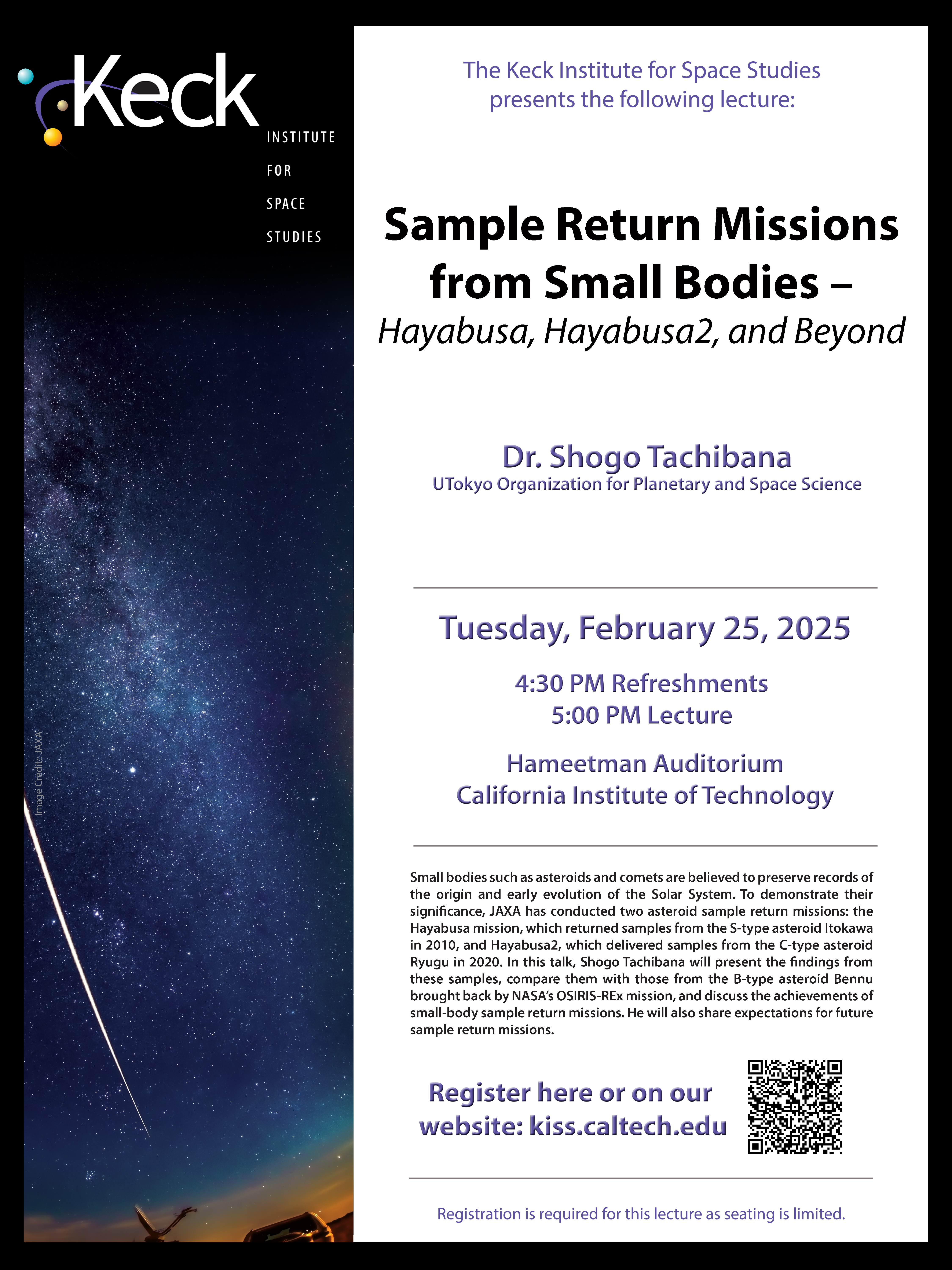Small bodies such as asteroids and comets are believed to preserve records of the origin and early evolution of the Solar System. To demonstrate their significance, JAXA has conducted two asteroid sample return missions: the Hayabusa mission, which returned samples from the S-type asteroid Itokawa in 2010, and Hayabusa2, which delivered samples from the C-type asteroid Ryugu in 2020. In this talk, Shogo Tachibana will present the findings from these samples, compare them with those from the B-type asteroid Bennu brought back by NASA’s OSIRIS-REx mission, and discuss the achievements of small-body sample return missions. He will also share expectations for future sample return missions.